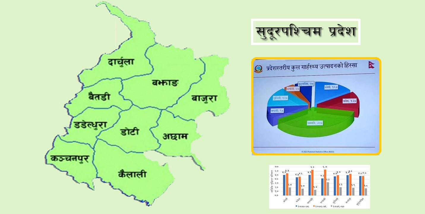 सुदूरपश्चिमले ३ खर्ब ७६ अर्ब योगदान दिने : सुदूरपश्चिम प्रदेशको कुल गार्हस्थ उत्पादन उपभोक्ताको मूल्यमा करिब ३ खर्ब ७६ अर्ब हुने अनुमान गरिएको छ भने गत आवको संशोधित अनुमान करिब ३ खर्ब ४५ अर्ब रहेको छ । गत आवमा राष्ट्रिय तहमा कुल गार्हस्थ उत्पादनको ७.० प्रतिशत हिस्सा ओगटेको यस प्रदेशले यस आवमा समेत ७।० प्रतिशत योगदान पु¥याउने अनुमान छ ।यसैगरी, गत आवमा कुल गार्हस्थ उत्पादनको वृद्धि दर ४.७८ प्रतिशत थियो भने यस आवमा संकुचन आई १.७८ प्रतिशत कायम रहने अनुमान छ । कुल गार्हस्थ उत्पादनमा सबैभन्दा बढी योगदान ३३.४ प्रतिशत कृषि क्षेत्रको छ भने सबैभन्दा कम योगदान ०.१ प्रतिशत प्रशासनिक सहयोगी सेवा क्षेत्रको रहेको छ ।
