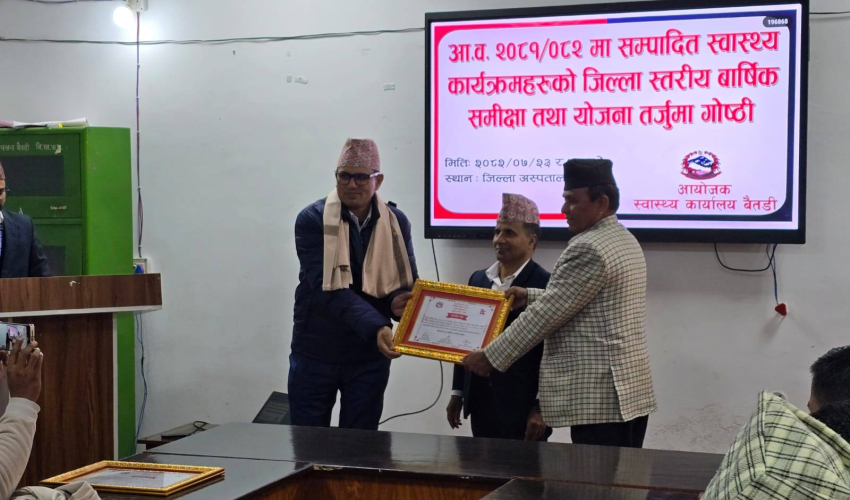 स्थानीय तहहरुले गत आर्थिक बर्षमा स्वास्थ्य क्षेत्रमा सम्पादन गरेका कामहरुको आधारमा उत्कृष्ट पालिका छनौट गरिएको स्वास्थ्य कार्यालय बैतडीका प्रमुख तीर्थराज भट्टले जानकारी दिए । सामाजिक विकास मन्त्रालयले तय गरेका सूचक, समन्वय र सहकार्य तथा स्वास्थ्य क्षेत्रमा नवीनतम् अभ्यास गरेका पालिकाहरुलाई उत्कृष्ट पालिकाको रुपमा छनौट गरिएको हो ।